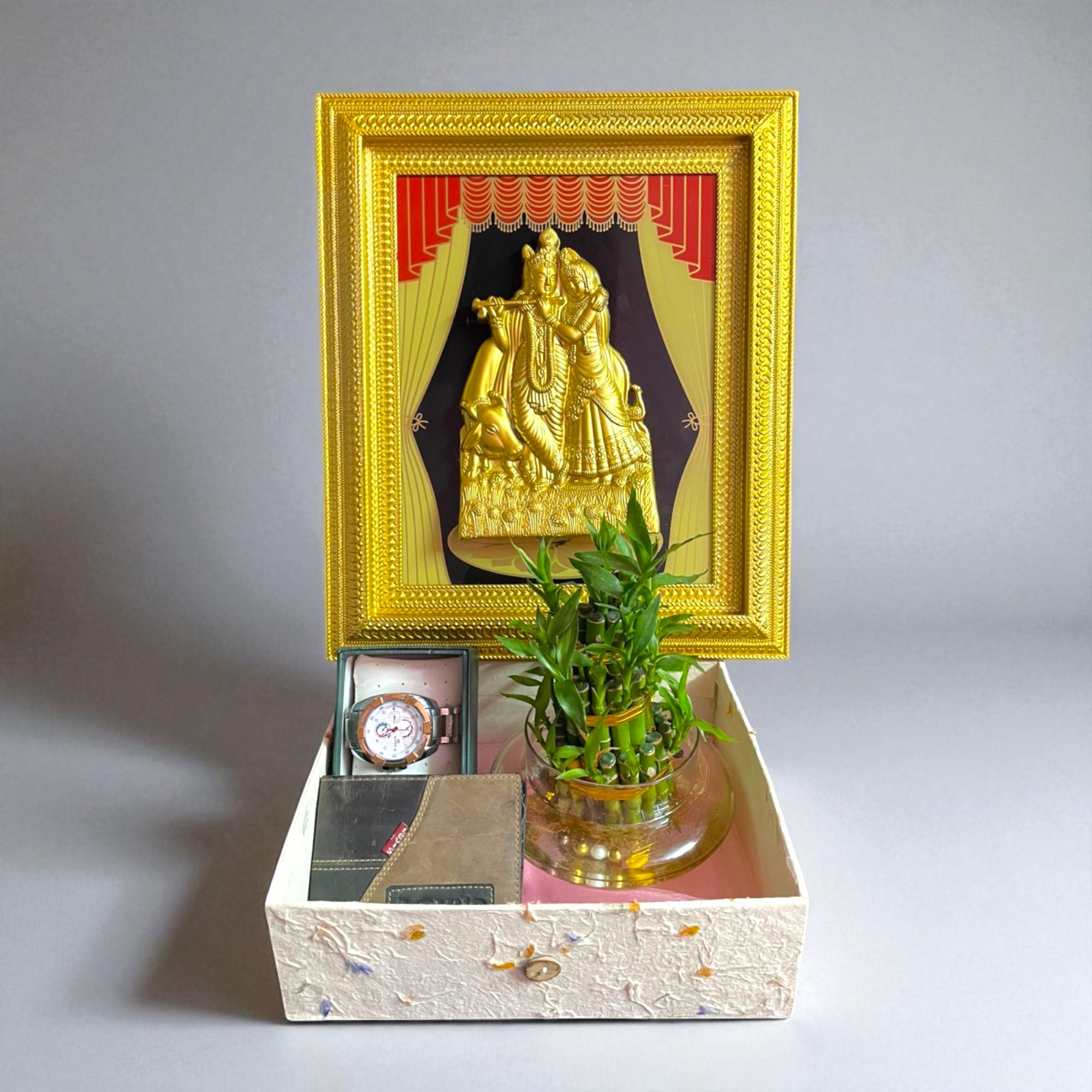 Celebrate your love with this thoughtful anniversary combo gift – a perfect mix of blessings, charm, and style. The golden Radha Krishna frame symbolizes eternal love and togetherness, while the lucky bamboo plant brings positivity and growth. A stylish wristwatch marks every precious moment, and the sleek leather wallet adds a daily touch of love and utility.