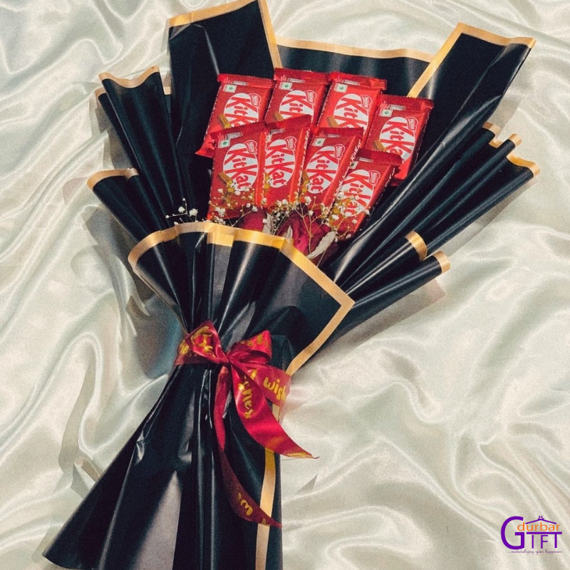 Make every occasion sweeter with this elegant chocolate bouquet, thoughtfully arranged with rich and delicious KitKat bars. Wrapped in luxurious black and gold paper and finished with a vibrant red ribbon, this bouquet offers a perfect blend of style and sweetness.