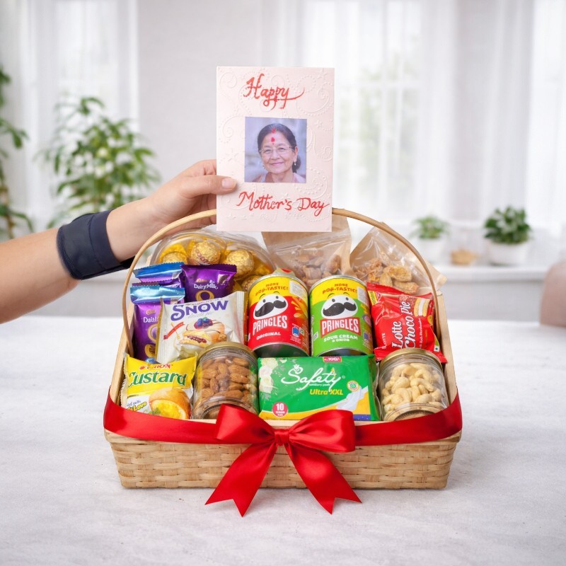 Celebrate Mother’s Day with a meaningful and thoughtful gift that combines both love and care. This beautifully arranged basket includes a delightful selection of chocolates, snacks, and nutritious dry fruits, along with essential personal care items for everyday comfort.